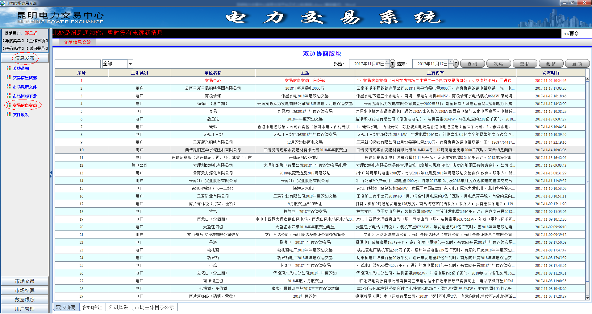 針對雙邊交易,昆明電力交易中心在交易系統(tǒng)中推出“交易信息交流”模塊,打造云南電力市場的BBS,買賣雙方線上即時溝通,大大提高交易效率,降低交易成本,得到了各市場主體的一致好評。