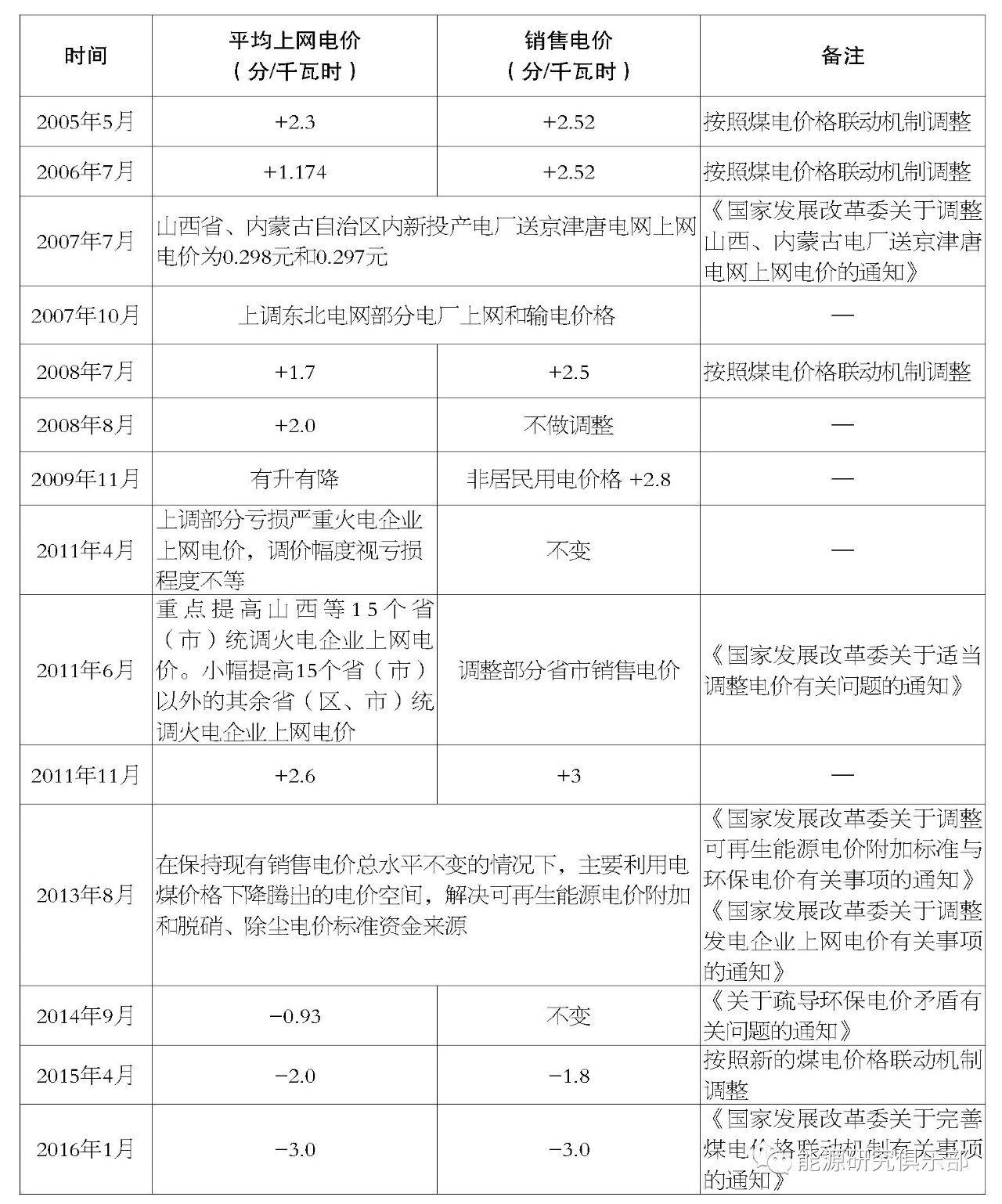 2005年以來電價調(diào)整情況