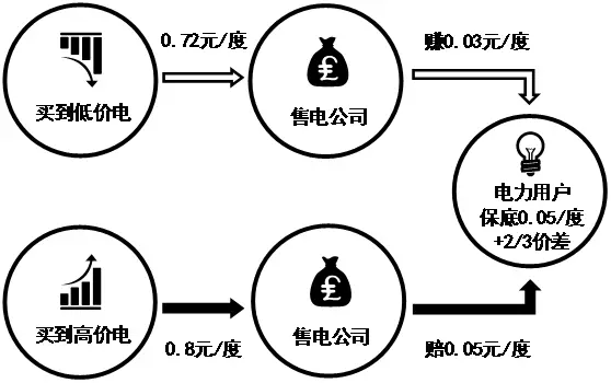 1、售電公司先和電力用戶約定兩件事,一是給電力用戶的保底降價,這里假設(shè)是0.1元/度。二是未來的價差分成比例,比如說,電力用戶拿2/3,售電公司拿1/3。