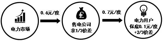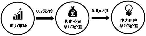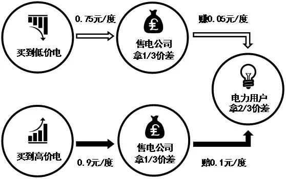 3、售電公司開始和電力用戶按照1:2的比例分成這部分降價,在0.3元的降價幅度中,售電公司自己留下0.1元/度,電力用戶享受0.2元/度的降價幅度。