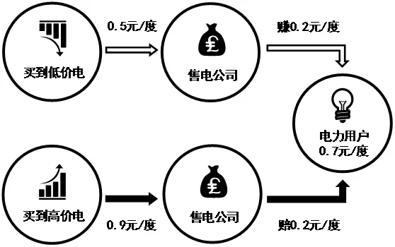 3、如果售電公司競到的電價比0.8元/度低,就可以盈利,例如0.75/度,雖然比0.7元/度的平均價高,但售電公司還是能賺0.05元/度。