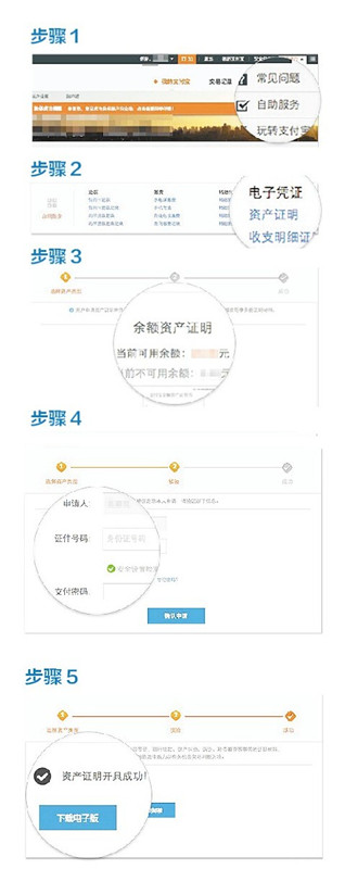 貸款買房,貸款買車,都要求開具個人資產(chǎn)證明,跑銀行排隊是免不了的,對此,支付寶宣布,推出電子憑證功能?! ≈Ц秾毞矫娣Q,隨著余額寶等互聯(lián)網(wǎng)金融產(chǎn)品的普及,開具網(wǎng)上資產(chǎn)和收支明細作為出國簽證、銀