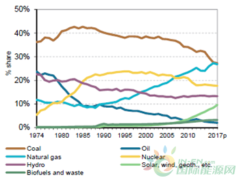 1974年~2017年經(jīng)合組織發(fā)電量,按來源劃分
