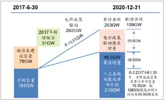 截止2016年年底,我國(guó)已核準(zhǔn)未建設(shè)的風(fēng)電項(xiàng)目合計(jì)容量在84GW,同時(shí)國(guó)家能源局在2017年7月發(fā)布了《2017-2020年風(fēng)電新增建設(shè)規(guī)模方案》提出2017年新增建設(shè)規(guī)模30.65GW。而電價(jià)調(diào)整政策規(guī)定,2018年1月1日前核準(zhǔn),2019年底前建設(shè)的項(xiàng)目得0.47-0.60元/Kwh的上網(wǎng)電價(jià),否則上網(wǎng)電價(jià)將被調(diào)整為0.40-0.57元/Kwh。上述項(xiàng)目需要在2020年前開工建設(shè)才能獲得較高的電價(jià),即使除去因各種原因不能建設(shè)的風(fēng)電項(xiàng)目,年均項(xiàng)目的建設(shè)規(guī)模也有可能超過25GW。