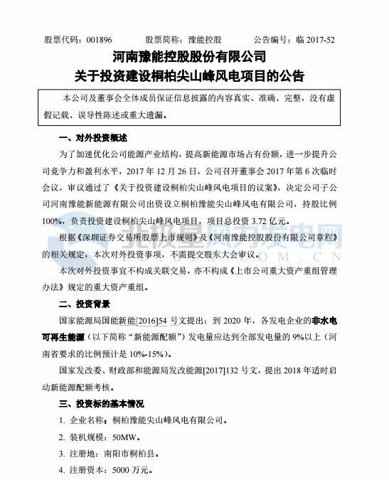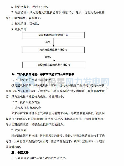 河南豫能控股股份有限公司12 月 26 日召開董事會 2017 年第 6 次臨時 會議,審議通過了《關(guān)于投資建設(shè)桐柏尖山峰風(fēng)電項目的議案》,決定出資設(shè)立桐柏豫能尖山峰風(fēng)電有限公司,持股比例 100%,投資建設(shè)桐柏尖山峰風(fēng)電項目,該項目裝機(jī)規(guī)模50MW,注冊資本5000 萬元,項目總投資 達(dá)到3.72 億元。以下是會議原文: