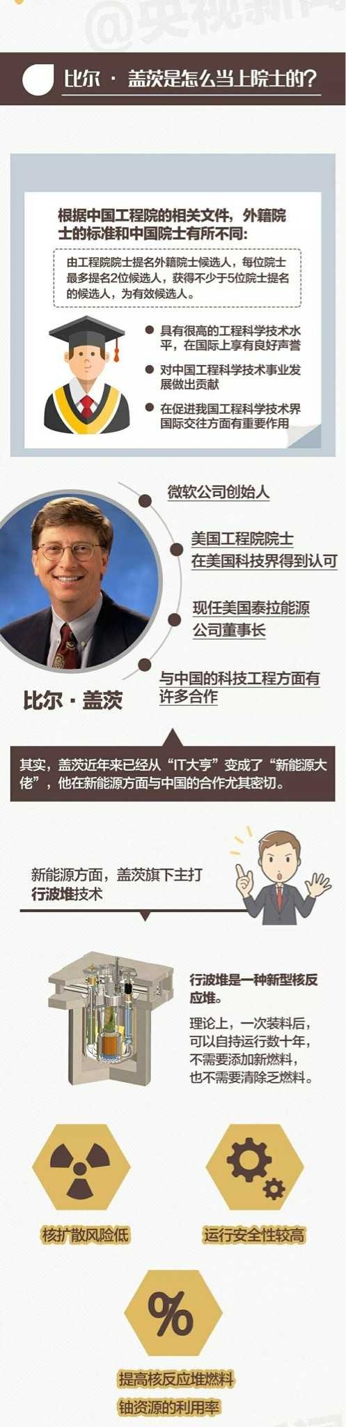 入選中國工程院院士需要有較高的科學技術(shù)水平和良好的聲譽,對中國工程科學技術(shù)發(fā)展有突出貢獻,在促進中國工程科學技術(shù)界國際交往方面有重要作用。而比爾˙蓋茨本身的實力,以及在新能源領(lǐng)域的一系列舉動可能是他榮獲中國工程院外籍院士頭銜的根源。