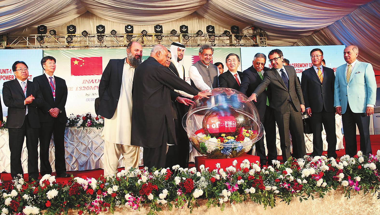 巴基斯坦總理阿巴西(右六)、中國電建董事長晏志勇(右五)、卡塔爾AMC公司董事長賈西姆(右七),以及與會嘉賓共同觸摸啟動(dòng)機(jī)組的水晶球。 康從欽 攝