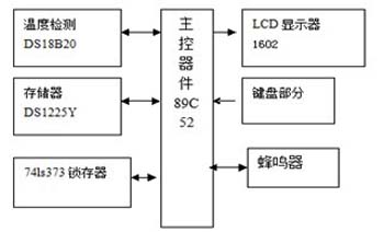 系統(tǒng)框如圖1所示。主控模塊用于控制其他模塊的運(yùn)行和協(xié)作,其中我們利用測(cè)溫模塊得出的數(shù)據(jù)進(jìn)行過(guò)濾存儲(chǔ),并利用鍵盤(pán)接口查詢會(huì)顯出超出溫度范圍的數(shù)據(jù)和時(shí)間以備檢修人員查詢。