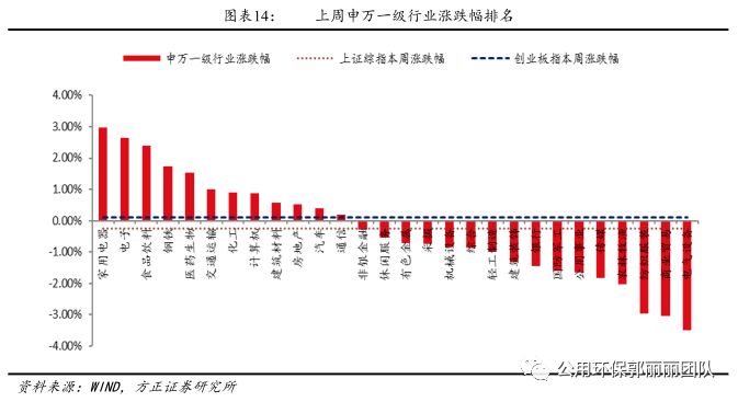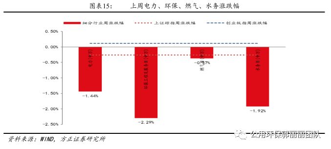 上周電力、燃?xì)?、水?wù)、環(huán)保工程板塊申萬二級指數(shù)漲跌幅分別為-1.44%、-0.37%、 -1.92%、-2.29%;上證綜指和創(chuàng)業(yè)板指數(shù)漲跌幅分別為-0.26%、0.12%。