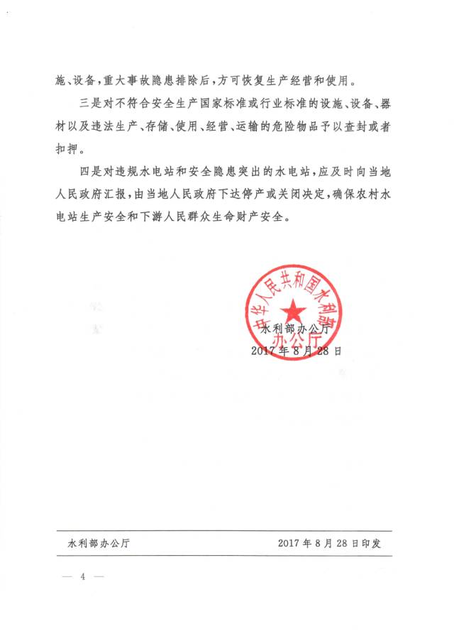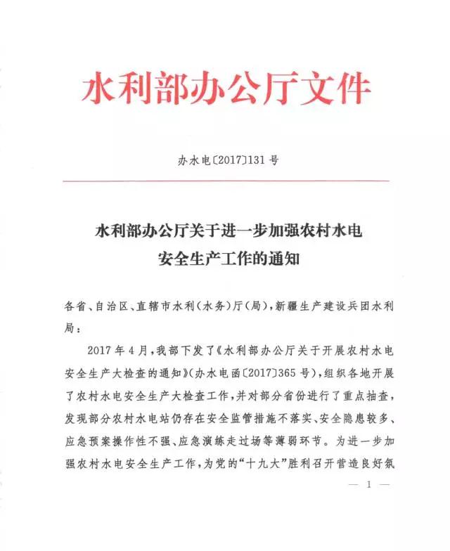 8月28日,水利部辦公廳下發(fā)《關(guān)于進(jìn)一步加強(qiáng)農(nóng)村水電安全生產(chǎn)工作的通知》的補(bǔ)充通知,原文如下:2017年4月,我部下發(fā)了《水利部辦公廳關(guān)于開(kāi)展農(nóng)村水電安全生產(chǎn)大檢查的通知》(辦水電函〔2017〕365號(hào)),組織各