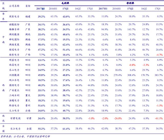 在我們統(tǒng)計的21家水電上市公司中,除甘肅電投外,2017年上半年所有水電上市公司均實現(xiàn)盈利。毛利率突出的公司是湖南發(fā)展(58.4%)和長江電力(55.2%)。二季度來水改善,水電公司毛利率和凈利率環(huán)比一季度普遍提升,出現(xiàn)虧損的公司僅有西昌電力一家。