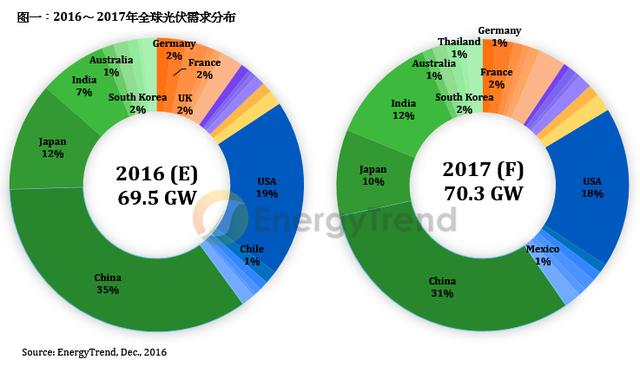 印度及新興市場(chǎng)的成長(zhǎng)幅度未能彌補(bǔ)中、美、日的需求衰退,一線(xiàn)組件廠為鞏固出貨,其2017年報(bào)價(jià)頻破底,預(yù)估組件市場(chǎng)均價(jià)將由2017年初的US$ 0.38/W,跌至年底的US$0.33/W,不僅中上游廠商將面臨極大虧損,一線(xiàn)組件廠也難維持過(guò)去15%以上的毛利區(qū)間。整體而言,2017年光伏供應(yīng)鏈由上至下利潤(rùn)都將低于2016年水平。