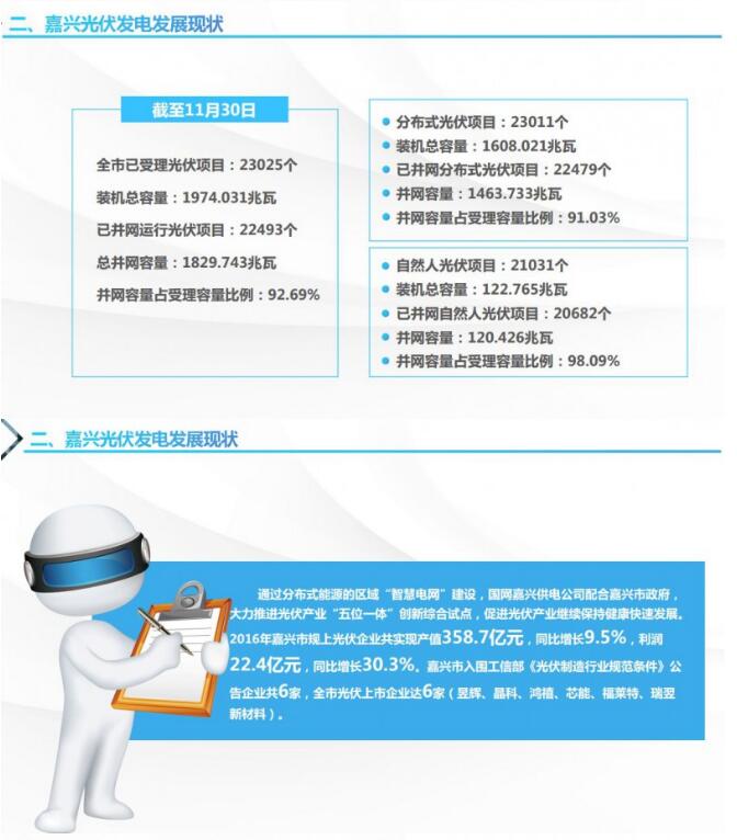 全國光伏看浙江,浙江光伏看嘉興。截止2017年年末,嘉興市的分布式光伏裝機總量已經(jīng)達到1 5G。光伏滲透率指標,2016年度嘉興的海寧市已高達