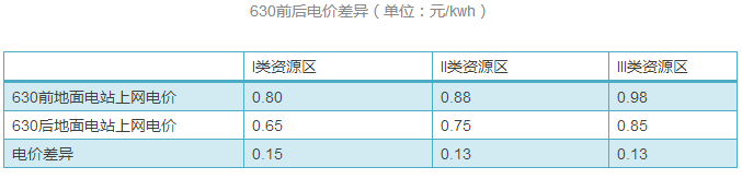 也就是說,“630”前后,I、II、III類資源區(qū)光伏電站(地面電站、全額上網(wǎng)的分布式)上網(wǎng)電價(jià)分別差0.15元、0.13元、0.13元。以I類資源區(qū)舉例,補(bǔ)貼下調(diào)幅度高達(dá)23%。