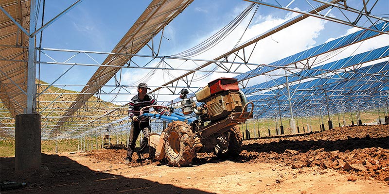其達(dá)吉村貧困戶在光伏電站內(nèi)耕地。王國棟 攝