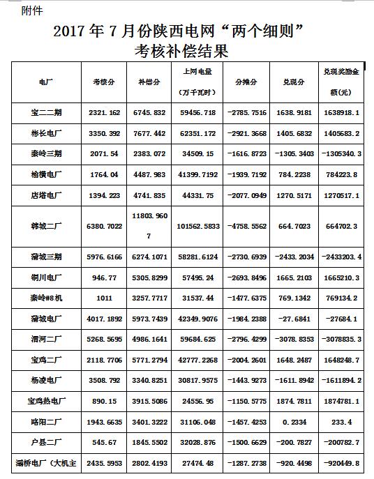 2017年7月份陜西電網(wǎng)“兩個(gè)細(xì)則”考核補(bǔ)償情況的通知