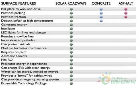 光伏發(fā)電路面設(shè)想在 2006 年由美國的一對科學家夫婦提出并開始研究。布魯索夫婦發(fā)明出一種正六邊形的太陽能電池板(SolarRoadway),其表面是一種超耐磨的特殊玻璃,承重最高達 125 噸,能保證汽車的安全行駛。Solarroadways 官網(wǎng)對 Solarroadway、混凝土、瀝青三種不同路面材料做了對比。