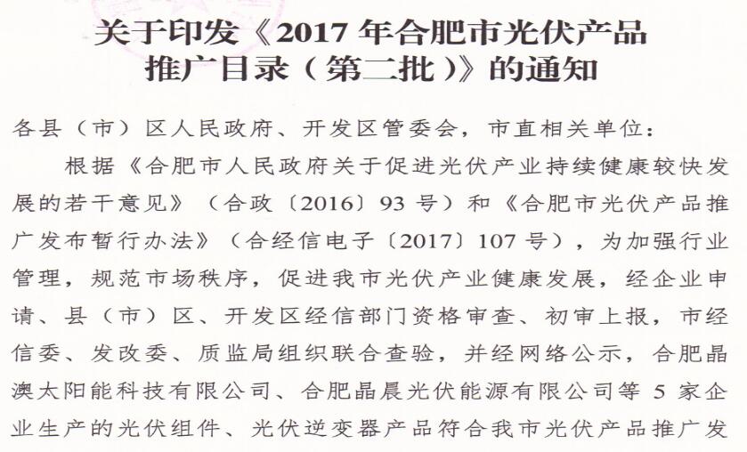 原標題:關于印發(fā)《2017年合肥市光伏產品推廣目錄(第二批)》的通知