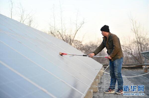 河間市行別營鄉(xiāng)東大漢村村民在一處小型光伏電站擦拭光伏板。近年來,河北省河間市積極探索光伏產(chǎn)業(yè)扶貧新路,采用“政府+企業(yè)+金融機構(gòu)+貧困戶”的合作模式,試點建設(shè)村級小型光伏扶貧發(fā)電站,讓貧困戶享受“陽光收益”。目前,河間市已建設(shè)5kw小型扶貧電站527座,全部實現(xiàn)并網(wǎng)發(fā)電,收益惠及近萬名群眾。