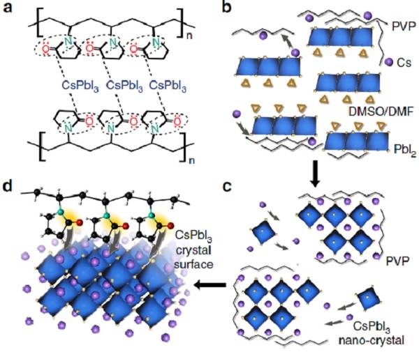 (b). 碘化銫鉛中的PbI2和Cs離子在DMF/DMSO溶劑中自發(fā)地與PVP分子組裝和相互作用,并保持亞穩(wěn)態(tài);