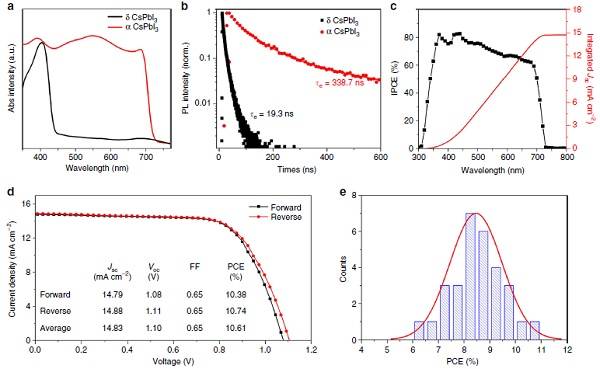 圖4:立方晶相碘化銫鉛鈣鈦礦薄膜的光學(xué)表征以及器件性能表征