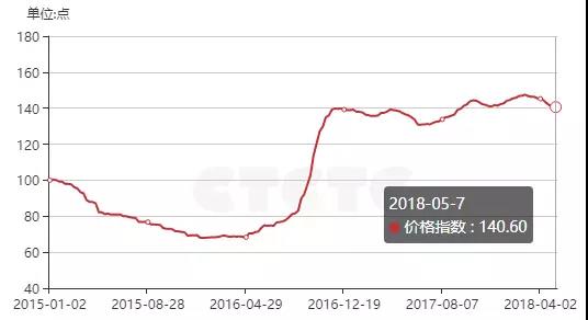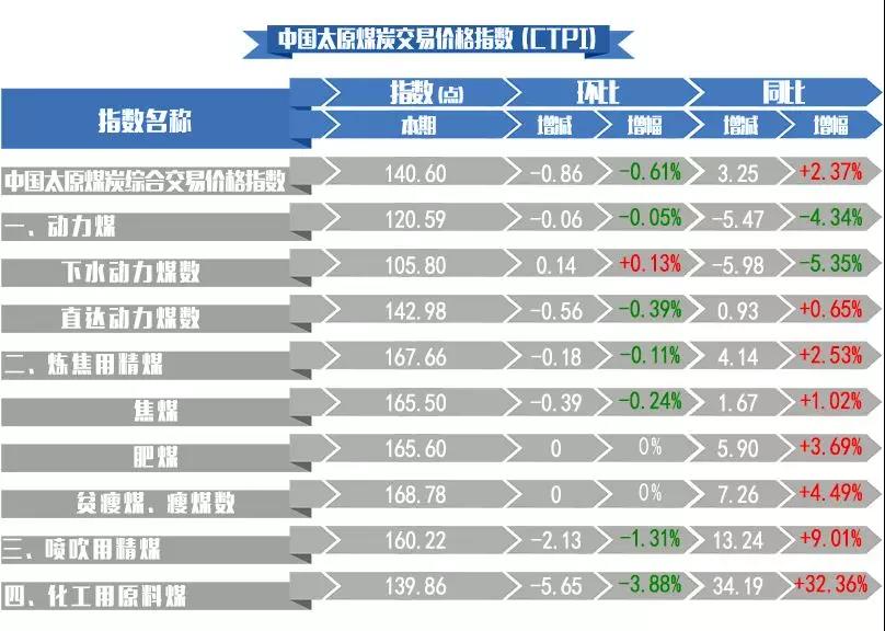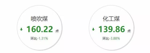 截至2018年5月7日,第248期中國(guó)太原煤炭綜合交易價(jià)格指數(shù)為140.60點(diǎn),環(huán)比下跌0.61%。其中:動(dòng)力煤指數(shù)120.59點(diǎn),環(huán)比下跌0.05%;煉焦用精煤指數(shù)167.66點(diǎn),環(huán)比下跌0.11%;噴吹用精煤指數(shù)160.22點(diǎn),環(huán)比下跌1.31%;化工用原料煤指數(shù)139.86點(diǎn),環(huán)比下跌3.88%。