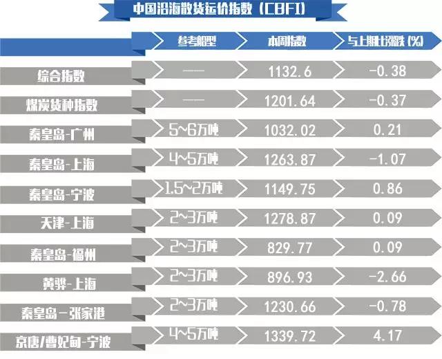 ★中國(guó)沿海(散貨)綜合運(yùn)價(jià)指數(shù)報(bào)收1132.6點(diǎn),較上周下跌0.4%。其中煤炭、糧食、金屬礦石、成品油運(yùn)價(jià)指數(shù)下跌,原油運(yùn)價(jià)指數(shù)維穩(wěn)。