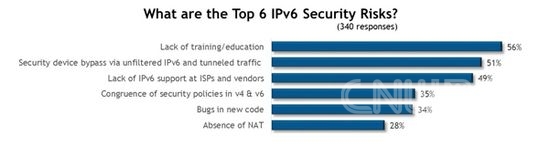 盡管IPv6已經(jīng)開始啟用,但網(wǎng)絡(luò)工程師仍然很謹(jǐn)慎,因?yàn)樗麄儞?dān)心IPv6的安全問題。下面是95000位網(wǎng)絡(luò)工程師投票選出的IPv6網(wǎng)絡(luò)安全中前6大安全風(fēng)險(xiǎn)?!  ?缺乏IPv6安全培訓(xùn) 教育?! ‖F(xiàn)在最大的風(fēng)險(xiǎn)是缺乏