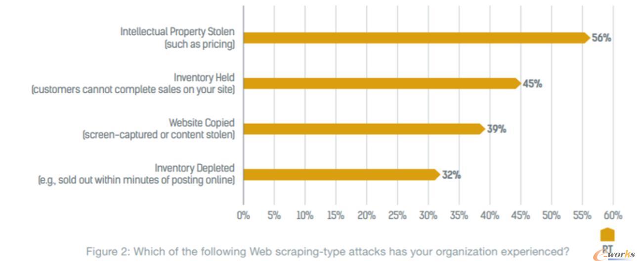 如前所述,計(jì)算機(jī)機(jī)器人程序是受訪者需要認(rèn)真對(duì)待的關(guān)鍵技術(shù)問(wèn)題。對(duì)那些能夠區(qū)分良性計(jì)算機(jī)機(jī)器人程序和不良計(jì)算機(jī)機(jī)器人程序的受訪者而言,不良計(jì)算機(jī)機(jī)器人程序通常會(huì)以Web專區(qū)攻擊的形式攻擊零售商。事實(shí)上,75%的零售商稱,Web刮取對(duì)他們的知識(shí)產(chǎn)權(quán)是一個(gè)很大的風(fēng)險(xiǎn)。Radware研究指出,72%的零售商都表示遭受了Web抓取攻擊的影響,包括采集報(bào)價(jià)信息(56%)、凍結(jié)庫(kù)存(45%)、網(wǎng)站復(fù)制(39%)和耗盡庫(kù)存(32%) (見圖2)。