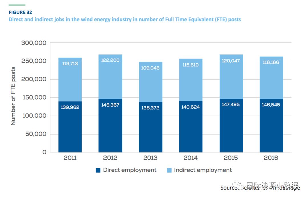 2016年到歐盟國(guó)家在風(fēng)電工業(yè)全職就業(yè)人數(shù)達(dá)到146,545人,其中有77,756人在風(fēng)機(jī)設(shè)備及零部件制造業(yè)(包括6628從事海上風(fēng)電設(shè)備制造);39,316人從事風(fēng)電技術(shù)服務(wù);21,824人從事風(fēng)電開(kāi)發(fā)商工作。另外,風(fēng)電還在其他經(jīng)濟(jì)領(lǐng)域間接創(chuàng)造了116,166個(gè)就業(yè)機(jī)會(huì)。