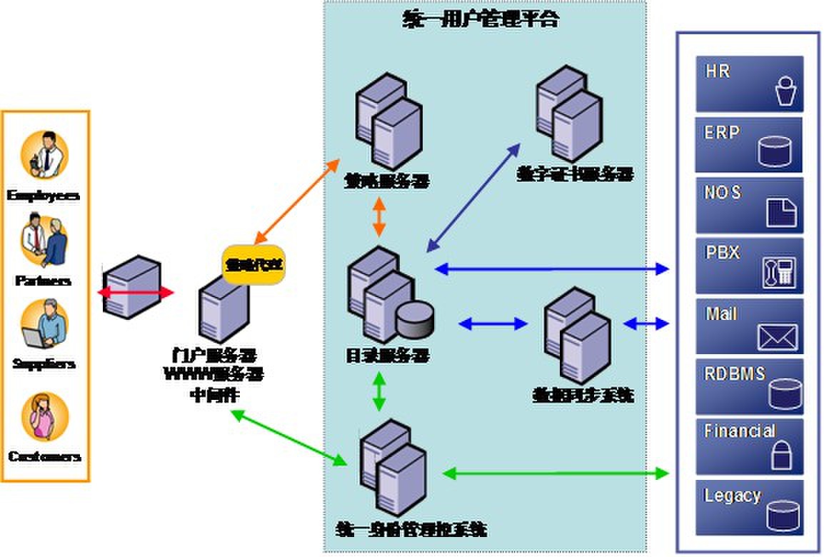 其中目錄系統(tǒng),CA系統(tǒng)已經(jīng)建立,統(tǒng)一身份管理系統(tǒng)和數(shù)據(jù)同步系統(tǒng)在本期項(xiàng)目中建設(shè),策略服務(wù)系統(tǒng)將在下期項(xiàng)目中建設(shè)。