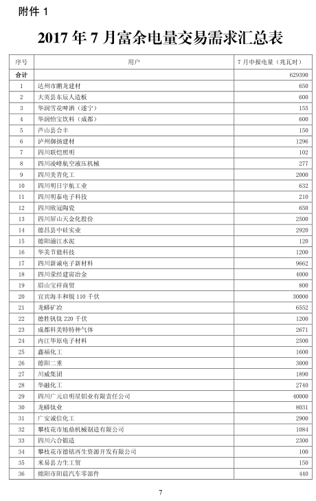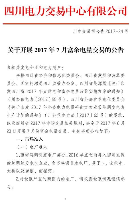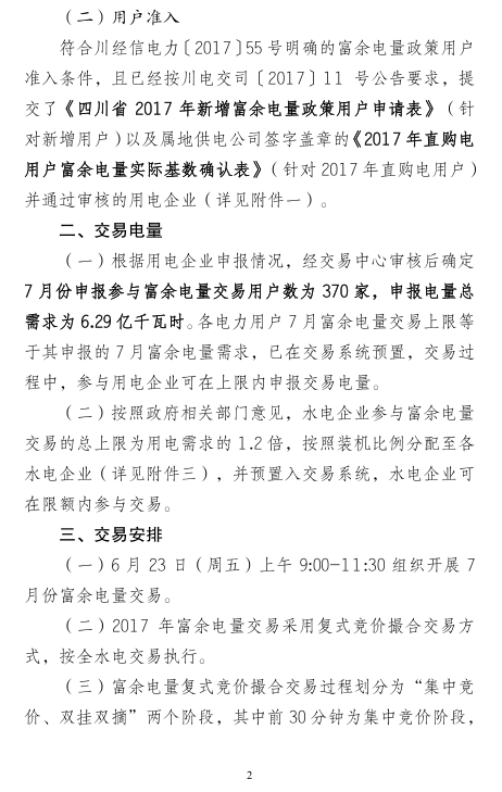 四川電力交易中心發(fā)布了《關(guān)于開展2017年7月富余電量交易的公告》,公告中稱,將于2017年6月23日開展7月份富余電量交易。根據(jù)用電企業(yè)申報(bào)情況,7月份申報(bào)參與富余電量交易用戶數(shù)為370家,申報(bào)電量總需求為6 29億