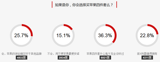 如今在蘋果Apple watch發(fā)布上市之后,傳統(tǒng)蘋果三件套要升級為全新四件套了。蘋果的數(shù)碼產(chǎn)品牌子響亮,體驗好有逼格,自然是吸引很多學(xué)生用戶去追捧攀比,而在我們的調(diào)查中累積也有48.5%的用戶表示會購買,認(rèn)為是裝X利器。但是如今要想擁有這樣的蘋果四件套至少也得上萬元,這對不少工薪家庭來說還是一筆不小的開支,這也難怪成為不少父母難以承受的痛,在我們調(diào)查中就有36.3%的用戶表示完全不關(guān)注蘋果四件套。