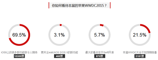 可以說,針對iPhone版的iOS9并沒有很多讓人眼前一亮的新功能,反倒是針對iPad版的iOS9引入了一些似曾相似的新功能,比如分屏操作以及視頻畫中畫體驗。可就算如此,在我們發(fā)起的調(diào)查中,最終還是有69.5%的用戶表示對iOS9上的新功能表示很期待,不知這其中iPhone和iPad用戶各占多少。當(dāng)然,還有21.5%的用戶表示本屆WWDC大會不如預(yù)期驚喜。這也難怪,一個僅稍做調(diào)整和優(yōu)化的iOS9,又沒有任何新硬件發(fā)布,如何能讓那么多的iPhone用戶滿足。