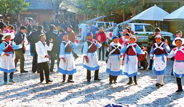納西婦女正在歡樂“打跳”。當(dāng)?shù)剜l(xiāng)民的恬美生活,少不了電力的支撐。