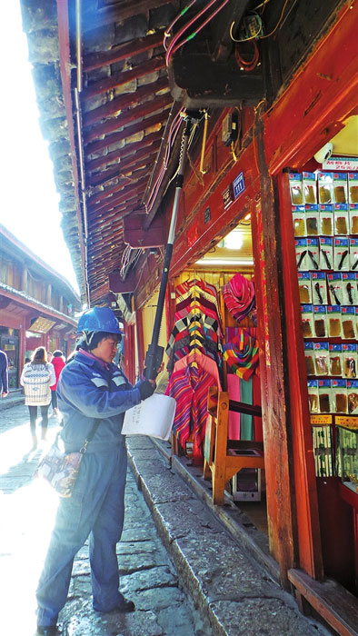 在雪山那邊,古城里邊,有一群“藍(lán)精靈”,他們勤勞又奮進(jìn),他們走街又串巷,守護(hù)著麗江古城日的美麗與夜的璀璨。