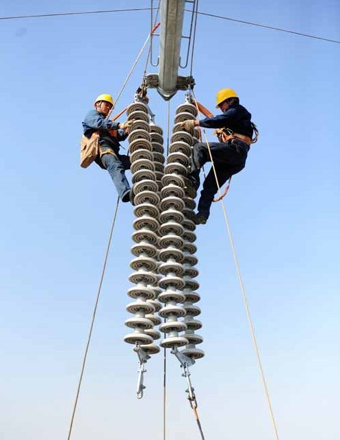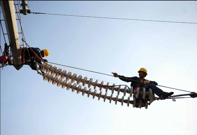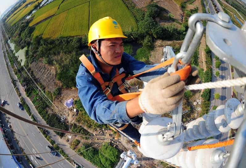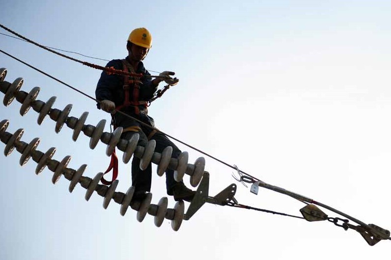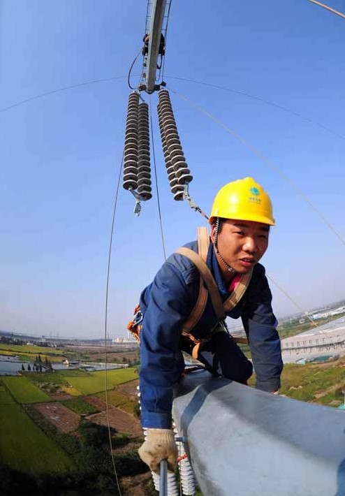 10月1日,在安徽省蕪湖市經(jīng)濟(jì)開(kāi)發(fā)區(qū)境內(nèi),安徽送變電工程公司施工人員正在40米高空安裝導(dǎo)線附件。