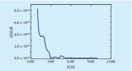 在傳輸距離為500 m的情況下,實際測得陰天天氣的能見度為18 km,計算得到α=2.06 dB/km。陰天誤碼率隨時間變化曲線如圖8所示。