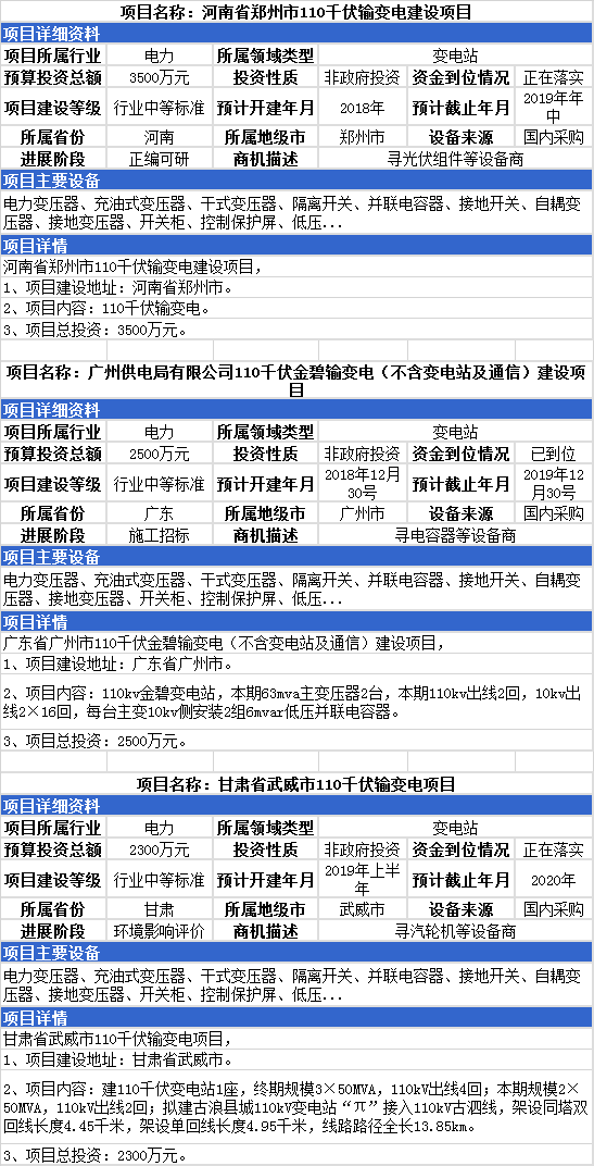 河南省鄭州市110千伏輸變電建設(shè)項(xiàng)目、廣州供電局有限公司110千伏金碧輸變電(不含變電站及通信)建設(shè)項(xiàng)目、甘肅省武威市110千伏輸變電項(xiàng)目。項(xiàng)目總投資最高達(dá)8300萬(wàn)元。