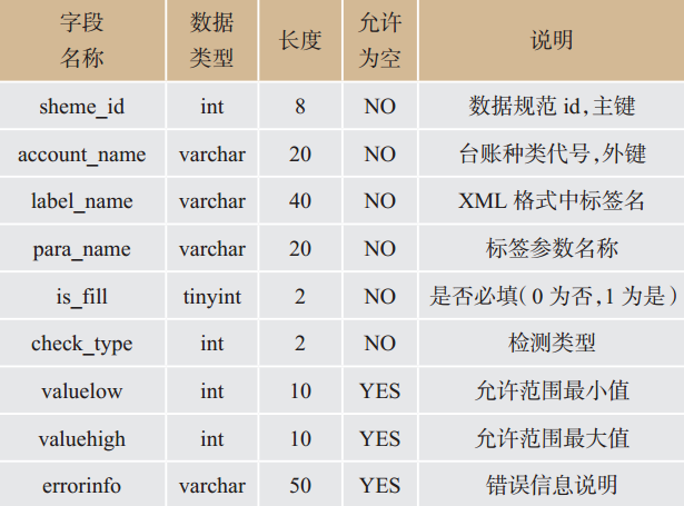 1)臺賬數(shù)據(jù)標(biāo)準(zhǔn)規(guī)范表。臺賬數(shù)據(jù)標(biāo)準(zhǔn)規(guī)范表(sy_scheme)中記錄的是所有臺賬數(shù)據(jù)的存儲規(guī)范,將規(guī)范標(biāo)準(zhǔn)化成可以用程序識別的標(biāo)準(zhǔn)規(guī)范表。表中check_type存放檢測類型,對于每一項不同的標(biāo)簽可能會有不一樣的檢測標(biāo)準(zhǔn),整體分為9類,所以在check_type中用數(shù)字代替檢測的類型(0無其他要求,1有閾值,2不能有中文,3必須是中文,4判斷日期,5不帶單位,6匹配標(biāo)準(zhǔn)格式,7生產(chǎn)廠家編碼,