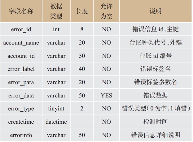 2)臺賬錯誤信息表。臺賬錯誤信息表(sy_errorinfo)中記錄臺賬數(shù)據(jù)質(zhì)量檢測結(jié)果,包括臺賬種類、每種臺賬中的id編碼、錯誤標(biāo)簽的名稱、錯誤標(biāo)簽對應(yīng)的參數(shù)名、錯誤數(shù)據(jù)、錯誤類型、檢測時間、錯誤信息說明。其中錯誤類型是為了之后生成報表能統(tǒng)計出缺失率和錯誤率;錯誤信息說明是保存錯誤數(shù)據(jù)的出錯原因,方便有針對性修改數(shù)據(jù)。臺賬錯誤信息表的表結(jié)構(gòu)如表4所示。