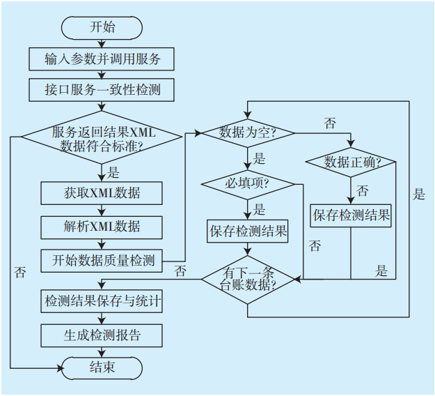 系統(tǒng)主要功能是臺賬的數(shù)據(jù)質(zhì)量檢測,首先選擇待測臺賬數(shù)據(jù)類型,輸入Web訪問地址,點擊開始檢測后由按鈕響應(yīng)獲取用戶輸入的數(shù)據(jù),調(diào)用獲取所有臺賬ID接口,再用返回的ID數(shù)據(jù)調(diào)用待測臺賬數(shù)據(jù),判斷是否符合標(biāo)準(zhǔn)格式。然后將XML格式數(shù)據(jù)轉(zhuǎn)為SimpleXML對象,實現(xiàn)對臺賬數(shù)據(jù)的解析。質(zhì)量檢測時先判斷是否為空,如果為空,且是必填項保存為缺失數(shù)據(jù),若不是必填項檢查下一條;如果不為空,判斷是否填寫正確。檢查下一條臺賬數(shù)據(jù)直到檢測完所有的臺賬數(shù)據(jù),保存檢測結(jié)果,對結(jié)果進(jìn)行統(tǒng)計匯總生成檢測報表。系統(tǒng)流程如圖3所示。