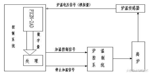 圖中,傳感器監(jiān)測調(diào)節(jié)量,并傳送給A/D模塊;后者使其離散化、數(shù)字化,以便能被PLC處理。PLC程序再參考要求值,對其進行處理,進而經(jīng)D/A模塊、執(zhí)行器作用到被控對象高爐上,達到使調(diào)節(jié)量按要求變化的目的。
