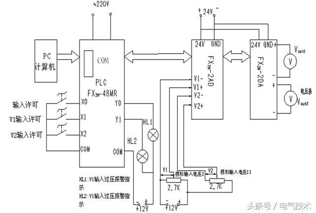 圖2 FX2N-2AD/FX2N-2DA模塊實際應(yīng)用電路模擬接線圖
