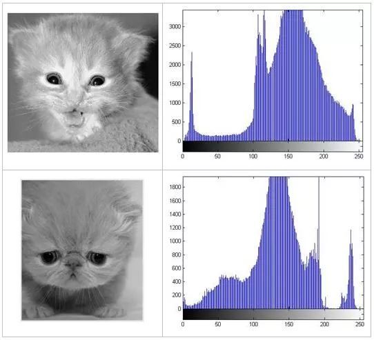 直方圖:表示圖像中具有每種灰度級(jí)的象素的個(gè)數(shù),反映圖像中每種灰度出現(xiàn)的頻率。圖像在計(jì)算機(jī)中的存儲(chǔ)形式,就像是有很多點(diǎn)組成一個(gè)矩陣,這些點(diǎn)按照行列整齊排列,每個(gè)點(diǎn)上的值就是圖像的灰度值,直方圖就是每種灰度在這個(gè)點(diǎn)矩陣中出現(xiàn)的次數(shù)。我們可以具體看一下下面兩個(gè)不同圖形的灰度直方圖: