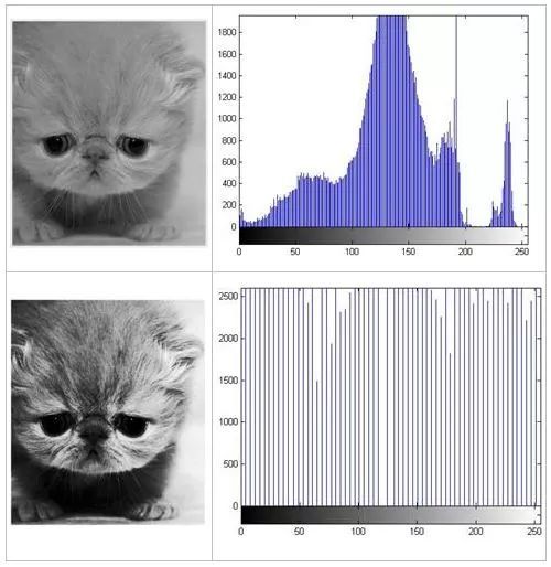 通過(guò)灰度變換將一幅圖像轉(zhuǎn)換為另一幅具有均衡直方圖的圖像,即在一定灰度范圍內(nèi)具有相同的象素點(diǎn)數(shù)的圖像的過(guò)程。下面是直方圖均衡化前后的圖形變化以及直方圖變化: