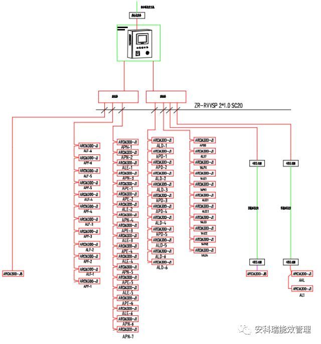 本項目中主要是針對樓層配電箱的進線回路安裝安科瑞嵌入式電氣火災探測器,通過嵌入式電氣火災探測器實時監(jiān)控配電回路的漏電流大小來顯示整個配電系統的工作狀態(tài)。