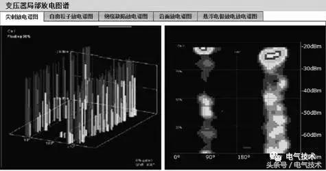 當(dāng)局部放電監(jiān)測系統(tǒng)監(jiān)測到有局放信號時,通過軟件查看當(dāng)前局部放電譜圖如圖2所示,可查詢放電信號的二維圖譜和三維圖譜,二維圖譜可直接顯示放電量大小,三維圖譜可判斷放電類型。根據(jù)監(jiān)測到的放電位置,可以有效發(fā)現(xiàn)變壓器運(yùn)行中的絕緣狀況,發(fā)現(xiàn)絕緣制造工藝的缺陷、安裝過程中的差錯,及時處理故障隱患,確保設(shè)備安全運(yùn)行。