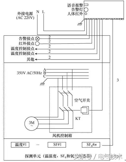 SF6泄漏檢測的核心感應(yīng)元件是SF6傳感器和氧氣傳感器,由高性能的嵌入式微控制器和放大器構(gòu)成信號處理單元。根據(jù)氣體的性狀及泄漏特征,SF6和氧氣監(jiān)測單元分布安裝于SF6開關(guān)下方離地面約10cm地方,主機(jī)通過網(wǎng)絡(luò)將監(jiān)測到的實(shí)時數(shù)據(jù)傳送至控制室計(jì)算機(jī)進(jìn)行動態(tài)監(jiān)控,當(dāng)監(jiān)測到有SF6氣體泄漏時,系統(tǒng)自動開啟風(fēng)機(jī)排風(fēng),具有10m長距離人體紅外探測、語音提示和高頻笛音報(bào)警、光報(bào)警、定時或超限觸發(fā)或強(qiáng)制風(fēng)機(jī)起/停操作等功能。SF6泄漏報(bào)警系統(tǒng)原理如圖3所示。