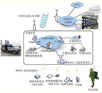 應(yīng)急指揮通信車通過回程網(wǎng)絡(luò)連接到指揮中心,保證現(xiàn)場通信終端能夠通過通信車訪問位于指揮中心信息網(wǎng)內(nèi)的業(yè)務(wù)服務(wù)器和相關(guān)數(shù)據(jù)庫。本方案采用COFDM(Coded Orthogonal Frequency Division Multiplexing,編碼正交頻分復(fù)用的簡稱)技術(shù)實(shí)現(xiàn)回程,是目前世界最先進(jìn)和最具發(fā)展?jié)摿Φ恼{(diào)制技術(shù)。它的實(shí)用價(jià)值就在于支持突破視距限制的應(yīng)用,是一種在無線電頻譜資源方面充分利用的技術(shù),可以對噪聲和干擾有著很好的免疫力?;爻探尤朦c(diǎn)可選擇就近的有光纖并能正常通信的變電站或電力分支機(jī)構(gòu)場所。COFDM技術(shù)能夠在“高速運(yùn)動(dòng)中”、“非視通條件下”實(shí)現(xiàn)高速無線網(wǎng)絡(luò)數(shù)據(jù)的實(shí)時(shí)傳輸,可完成“運(yùn)動(dòng)中和阻擋條件”下傳輸語音、數(shù)據(jù)、圖像等單、雙向網(wǎng)絡(luò)綜合業(yè)務(wù),是寬帶無線接入回程網(wǎng)絡(luò)的最佳選擇。